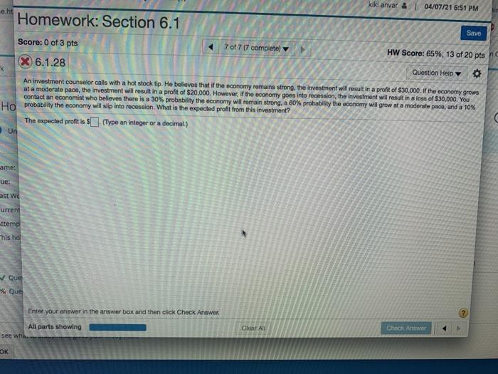 An investment counselor calls with a hot stock tip. 1An investment counselor calls with a hot stock tip. He believes that if the economy remains strong the investment will result in a profit of 40 comma 000 40000.